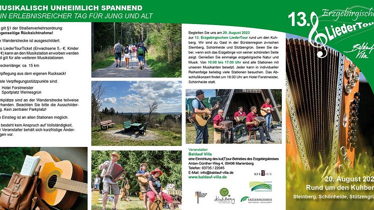 Am Sonntag, den 20. August 2023, findet die 13. Auflage der Erzgebirgischen LiederTour statt. Jährlich nehmen mehrere tausend Gäste an dieser musikalischen Wanderung teil. In diesem Jahr wird die beliebte Veranstaltung rund um den Kuhberg in der Bürstenregion um Schönheide, Stützengrün und Steinberg stattfinden und wurde durch die Baldauf Villa in Zusammenarbeit mit den drei Orten organisiert.