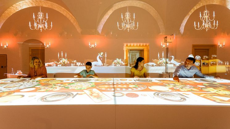 Ein Höhepunkt der Ausstellungspräsentation ist die 360 Grad-Projektionsshow „Tafelfreuden und Feste“, die den Besucher in die glanzvollen und festlichen Zeiten von Kurfürst August eintauchen lässt. Die eigens für die Ausstellung angefertigten Illustrationen schaffen zudem einen besonderen Kosmos rund um Kurfürst August und das Schlossjubiläum. Die 13 Ausstellungsräume vereinen kostbare Exponate renommierter Leihgeber aus Berlin, Nürnberg, Coburg, Dessau Wörlitz und Dresden, darunter ein Original-Gemälde mit dem Porträt Kaiser Maximilians II. Die spezielle Raumkonzeption erlaubt es, die Exponate, z.B. die aufwändig rekonstruierten und nachgeschneiderten Festkleider des Kurfürsten und der Kurfürstin, aus der Nähe zu betrachten.